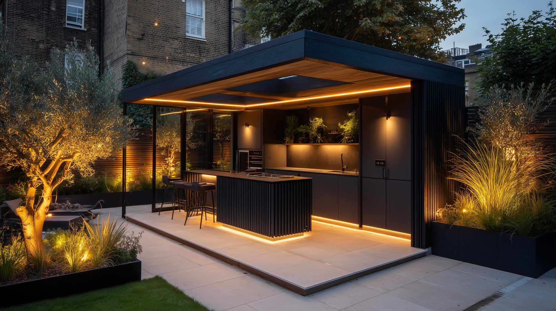 Compact elegance with efficient layouts, combining premium appliances and smart use of space for a refined outdoor kitchen in the city.