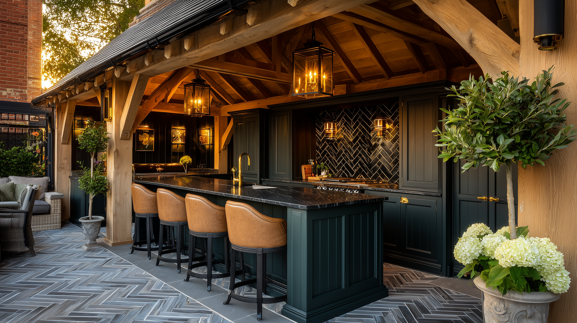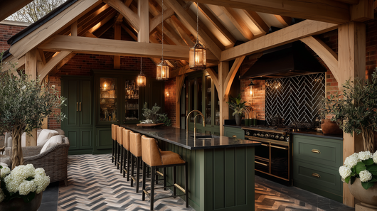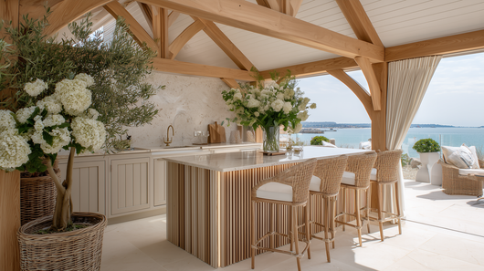 A contemporary kitchen blending natural finishes with bar areas for entertaining.